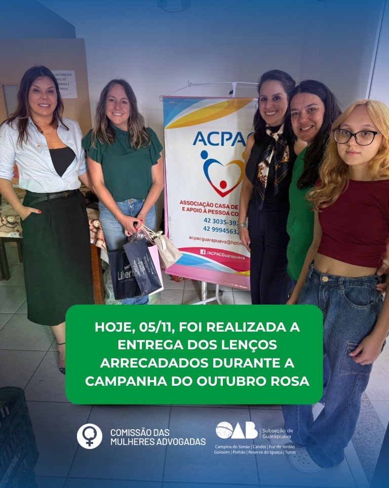 05 de novembro de 2025Hoje tivemos a entrega dos lenços arrecadados durante a campanha do Outubro Rosa, uma iniciativa da Comissão das Mulheres Advogadas, destinada à Casa de Passagem ACPAC.