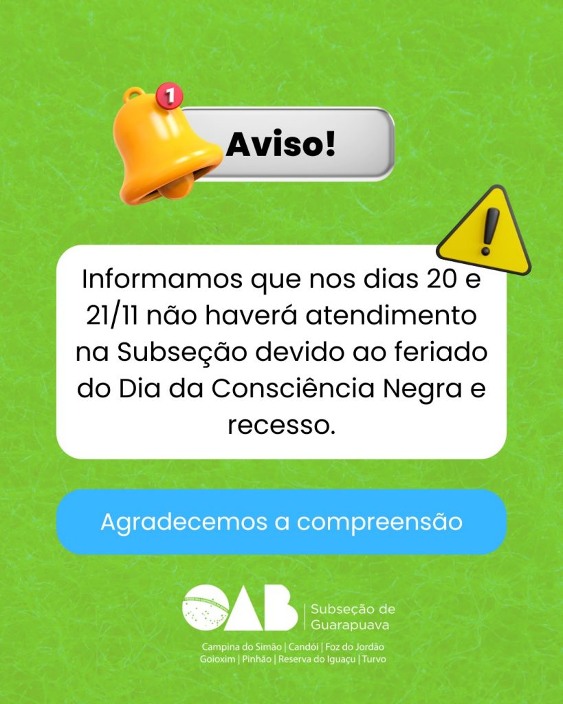 A OAB Guarapuava estará fechada nos dias 20 e 21/11 por conta do feriado da Consciência Negra e recesso.