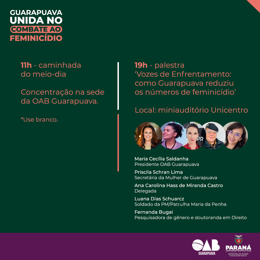 O evento é organizado pela OAB Guarapuava e Secretaria de Estado da Mulher, Igualdade Racial e Pessoa Idosa (Semipi).