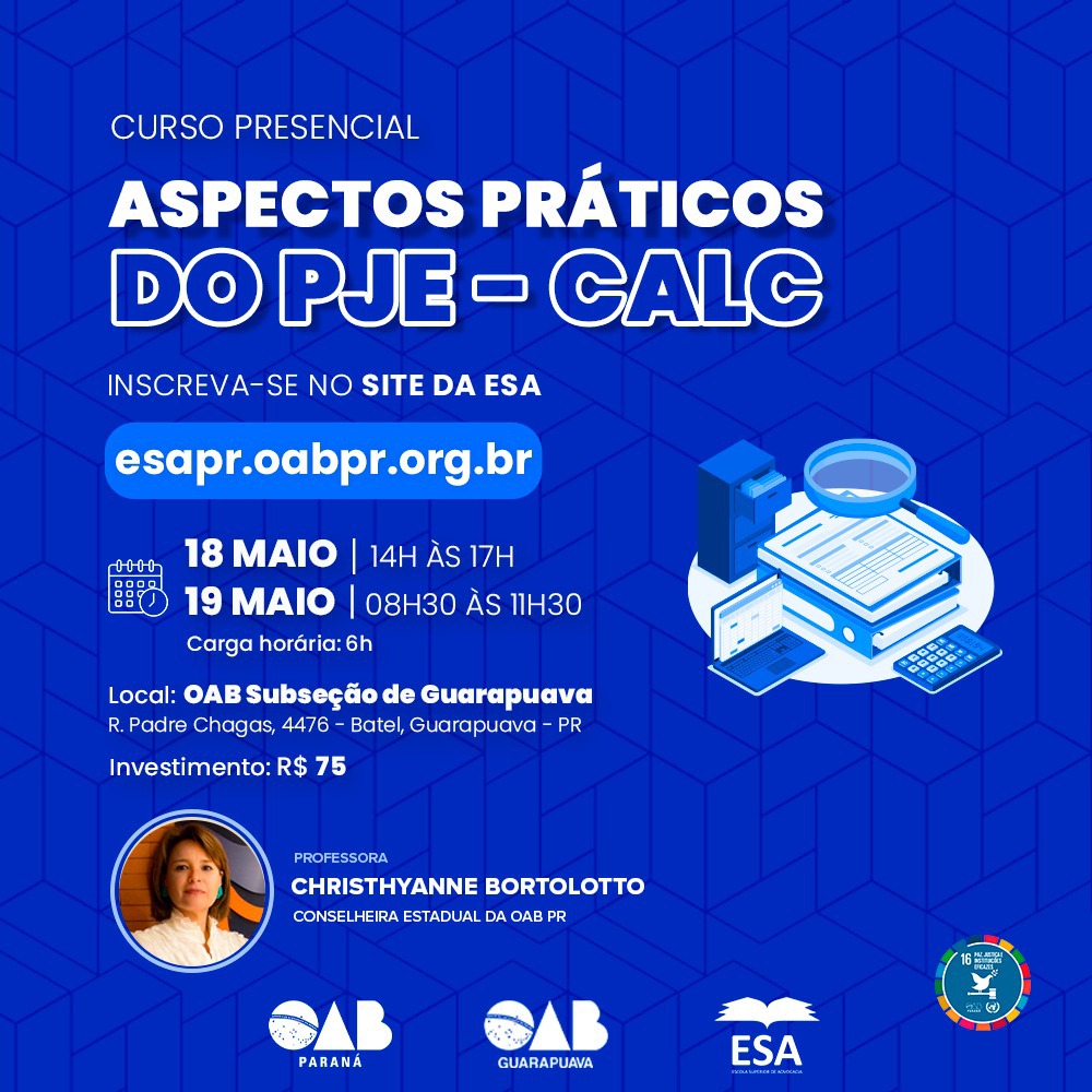 O PJe-Calc é uma ferramenta essencial para quem trabalha com cálculos trabalhistas e previdenciários. E se você quer aprender a dominá-la, temos uma novidade incrível: nos dias 18 e 19 de maio, a professora Christhyanne Bortolotto, mestre em Direito e Conselheira Estadual da OAB Paraná, ministrará o curso “Aspectos práticos do PJE Calc” na Subseção de Guarapuava.