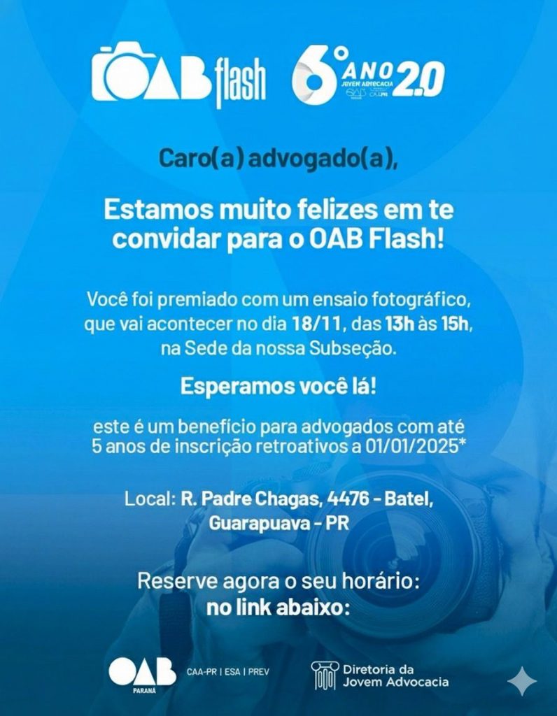 Se você tem até 5 anos de inscrição na OAB/PR, aproveite a oportunidade de participar de um ensaio fotográfico gratuito.