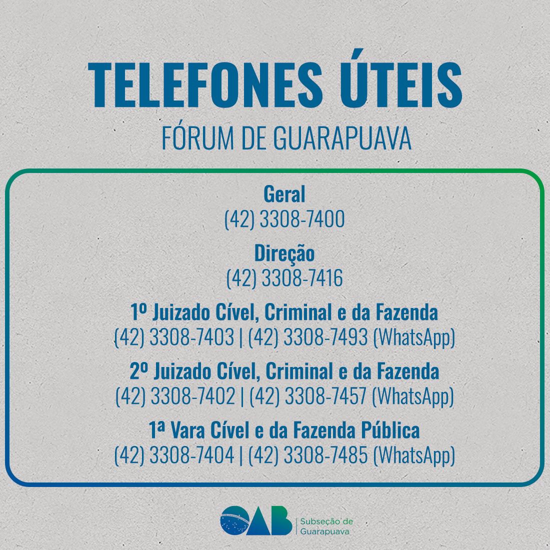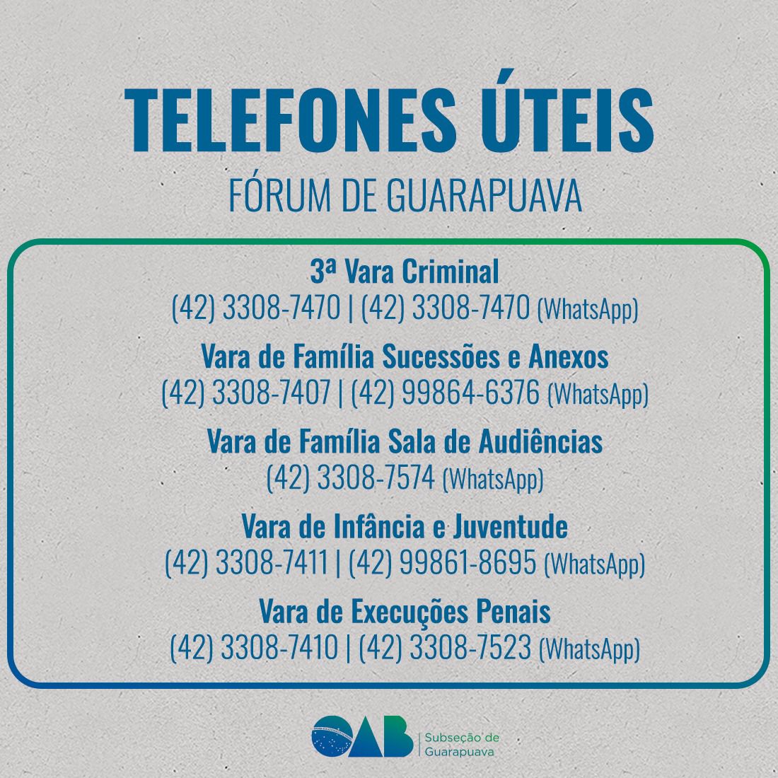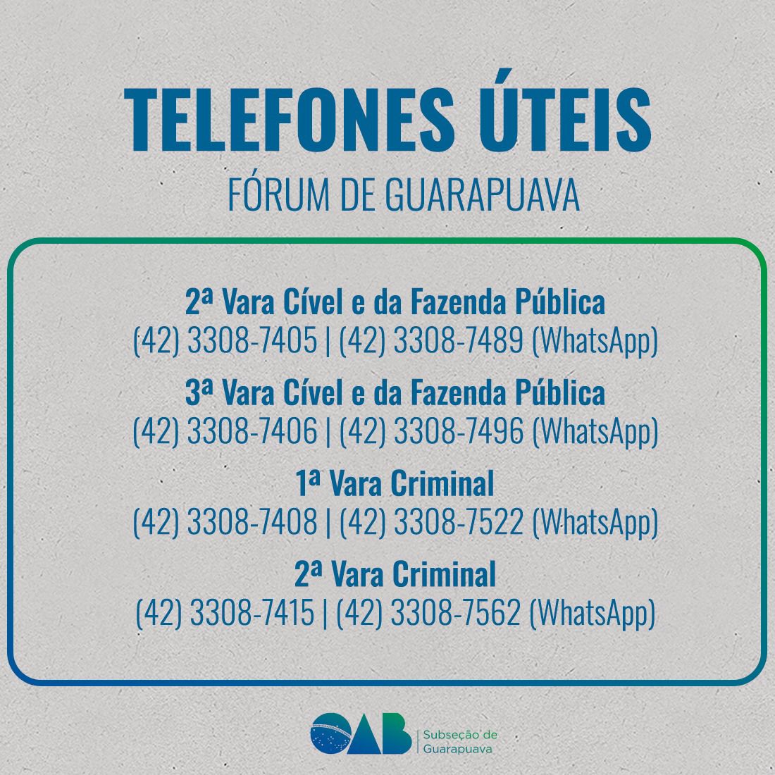 17 de janeiro de 2025A OAB Subseção de Guarapuava, comprometida em facilitar o dia a dia da advocacia, compartilha uma lista de telefones úteis com os contatos de órgãos e instituições de interesse da classe.